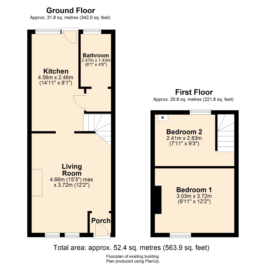 Ground Floor: Porch, Living Room, Kitchen, Bathroom. First Floor: Two bedrooms. Outside: Small forecourt garden and enclosed rear garden. Rear pedestrian access.