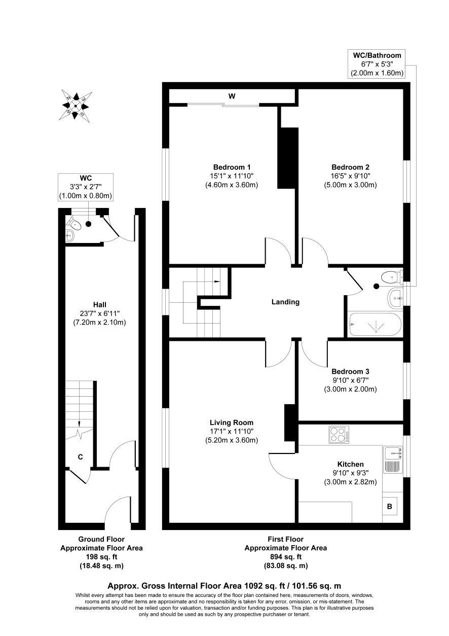 GROUND FLOOR Private Entrance Entrance Hallway With understairs cupboard housing the gas and electricity meters, ceramic tiled floor, radiator and rear door to the garden and parking space. W.C With low level WC, pedestal wash hand basin, fully tiled walls, mazaic tiled floor and radiator. FIRST FLOOR Landing With inset ceiling spotlights, radiator and smoke detector. Access to the loft space and thermostat for the central heating. Lounge/Dining Room With radiator, TV aerial point, coving to the ceiling and verticale blinds to the windows. Kitchen With a range of white units including base, wall and drawer units, electric oven and grill, four ring gas hob, stainled steel sink with mixer tap, plumbing for an automatic washing machine or dishwasher, wall mounted gas central heating boiler, chrome heated towel rail and ceramic tiled floor. Bedroom One With fitted wardrobes to one wall enclosed by sliding mirrored doors, radiator and verticle blinds to the window. Bedroom Two With radiator. Bedroom Three With radiator and roller blind to the window. Bathroom With white suite including encased bath with shower and curtain over, low level WC and pedestal wash hand basin. Fully tiled walls, extractor fan, and inset ceiling spotlights.