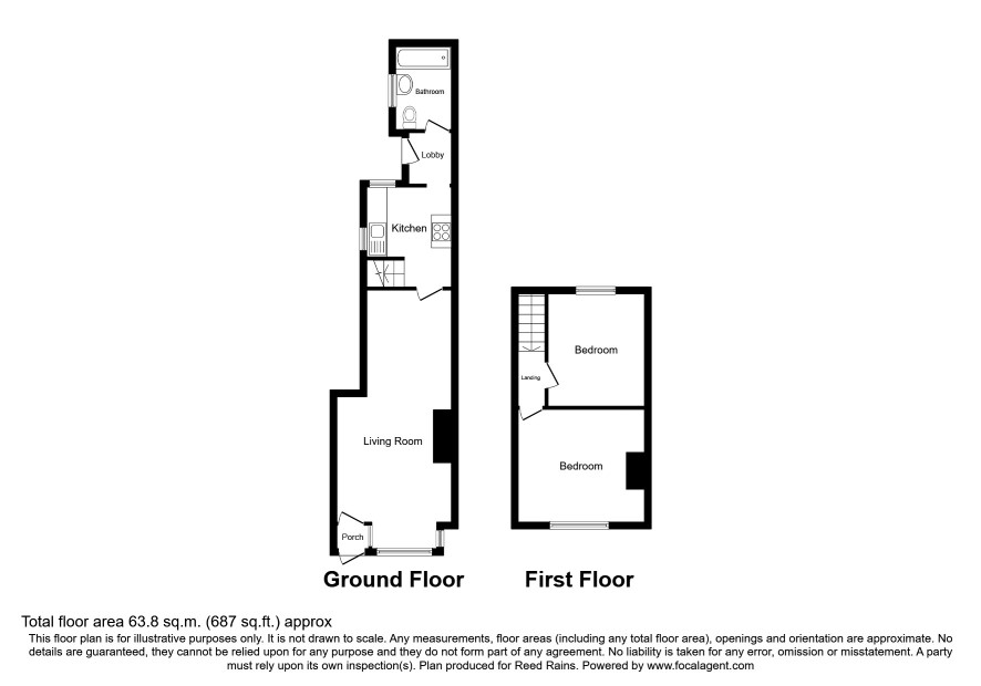 Entrance Porch:- Approach from the front through a double-glazed entrance door that leads into a useful entrance porch. From here a door leads through to the: Sitting/Dining Room 19'5” x 12'2” Of excellent proportions, this comfortable room features a double-glazed walk-in bay window that faces the front. Ceiling coving. Radiator. Door leading through to the: Kitchen 8'9” x 8'6” Enjoying dual aspects with double-glazed windows that face the side and rear. Fitted with an arrangement of base and wall mounted cabinets comprising cupboards and drawers with complementing laminated work surfaces and complementing splashbacks. Inset stainless steel sink unit. Inset four-ring ceramic hob with a built-in-under oven and extractor hood over. Leading through to the: Rear Lobby Bathroom 8'6” x 5'7” With a double-glazed window that faces the side. Appointed with a three-piece suite in white comprising panel bath with mixer tap/shower attachment over, wash hand basin and low flush WC. Extensive ceramic tiling to the walls. First Floor Landing A small central landing area where doors lead off to the two bedrooms. Principal Bedroom 12'2” x 11'1” With a double-glazed window that faces the front. Ceiling coving. Radiator. Bedroom 2 11'1” x 9'5” With a double-glazed window that faces the rear. Ceiling coving. Radiator. Outside To the front of the property is a small forecourt area, from which pedestrian access is provided to the front door. Rear Courtyard The rear of the property is an enclosed courtyard area for seating.