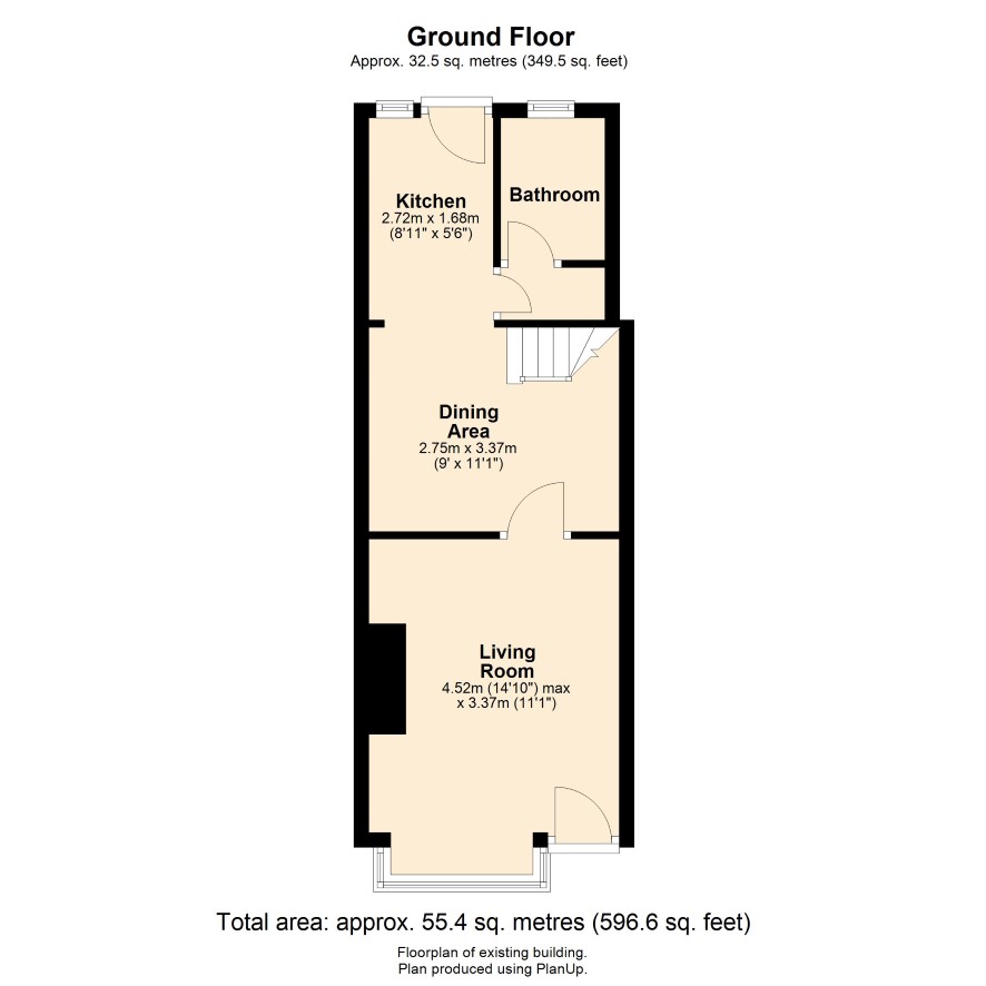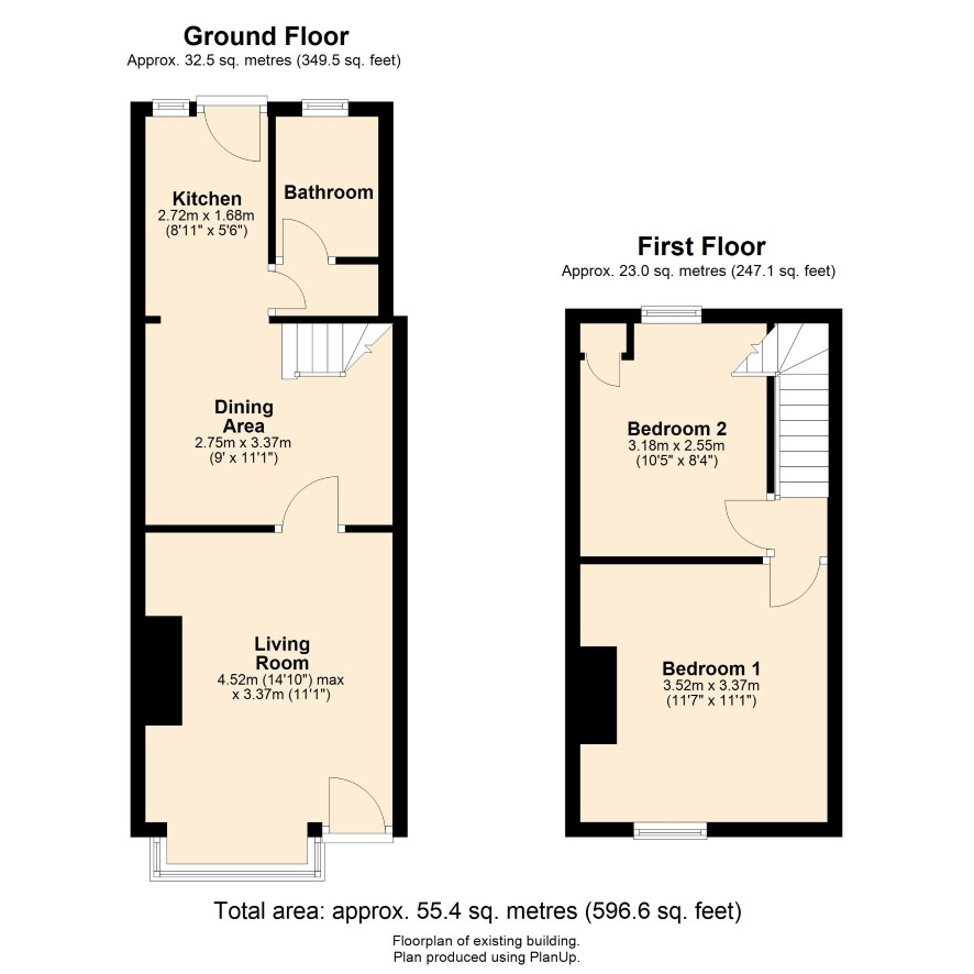 Ground Floor: Living Room, Dining Area, Kitchen, Bathroom. First Floor: Landing, two Bedrooms. Outside: Small courtyard to the front and rear.