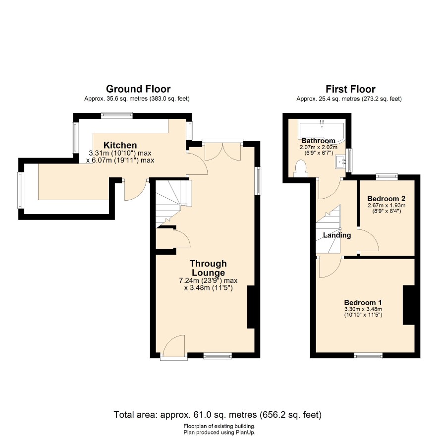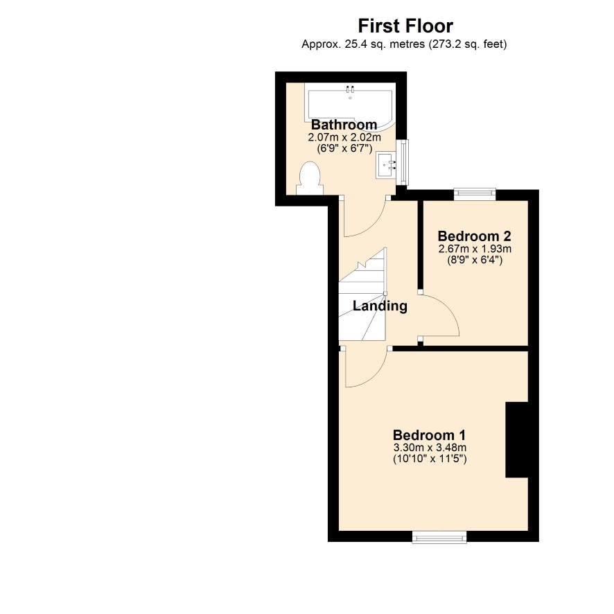 Ground Floor: Through Living Room, Kitchen. First Floor: Two double bedrooms and a bathroom. External: Front - To the front of the property is a walled garden with shaped lawn and a shared access footpath.