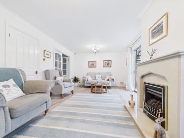 Entrance Hallway - 5'8" x 14'4" (1.73m x 4.37m) Radiator. Staircase to first floor. Doors leading to: WC - 3'10" x 8'8" (1.17m x 2.66m) Low flush WC, sink with pedestal and mixer tap. Plumbing for appliance. Kitchen - 9'5" x 16'2" (2.89m x 4.95m) Range of shaker style wall and base units. Eye-level electric oven and grill. Electric hob. Sink with mixer tap and right hand drainer. Side door to outside. Radiator. Double doors leading to: Living Room - 19'9" x 11'9" (6.03m x 3.60m) Radiator. Feature fireplace. Patio doors to outside. Door leading to: Sunroom - 17'1" x 8'9" (5.21m x 2.69m) Two radiators. French doors to outside. Door leading to: Garage - 12'2" x 27'7" (3.72m x 8.42m) Up and over garage door. Side door to outside.