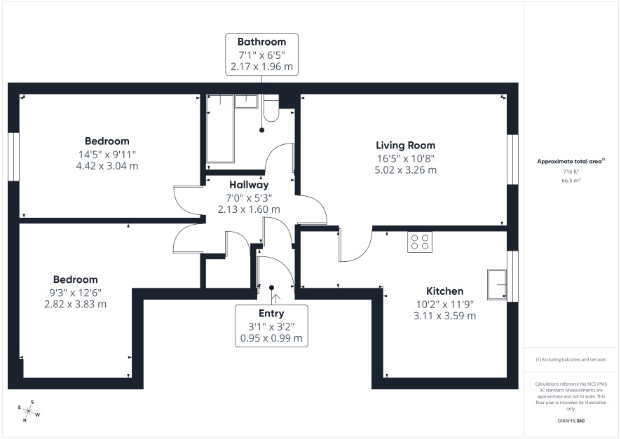 Entry - 3'1" x 3'2" (0.95m x 0.99m) Hallway - 7'0" x 5'3" (2.13m x 1.60m) Storage cupboard. Living Room - 16'5" x 10'8" (5.02m x 3.26m) Window to rear. Electric storage heater. Leading to: Kitchen - 10'2" x 11'9" (3.11m x 3.59m) Fitted kitchen with a range of wall and base units, work surfaces, cooker point, sink. Window to rear. Bedroom - 14'5" x 9'11" (4.42m x 3.04m) Window to front. Electric storage heater. Bedroom - 9'3" x 12'6" (2.82m x 3.83m) Electric storage heater. Bathroom - 7'1" x 6'5" (2.17m x 1.96m) Bath, low-level W/C, pedestal wash hand basin.