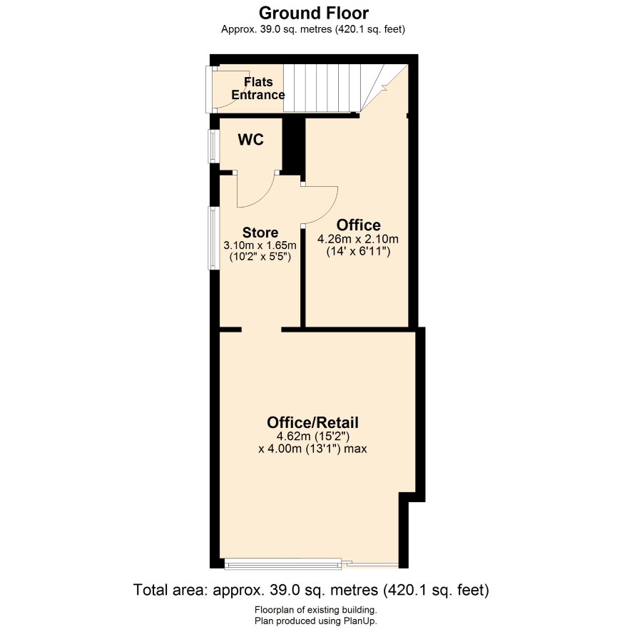 The ground-floor retail unit has an external security shutter, a ramped access opening into a small but open foyer/office area, a gas central heating radiator, and a wall-mounted air conditioning unit. To the rear of this area are storage and office accommodation with a small WC facility. It is estimated that the shop/office unit could achieve a rental value of £8,600 pa