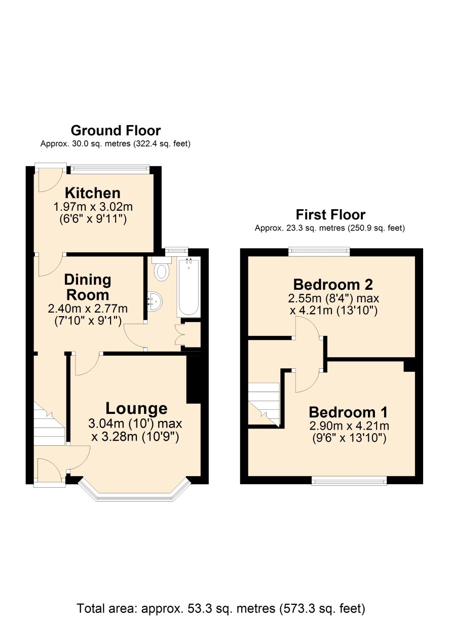Ground Floor: Entrance Hall, Lobby, Lounge, Dining Room, Bathroom, Kitchen. First Floor: Bedroom One, Bedroom Two. Outside: Paved forecourt. Lawned rear garden south-facing and fenced. Single Garage.