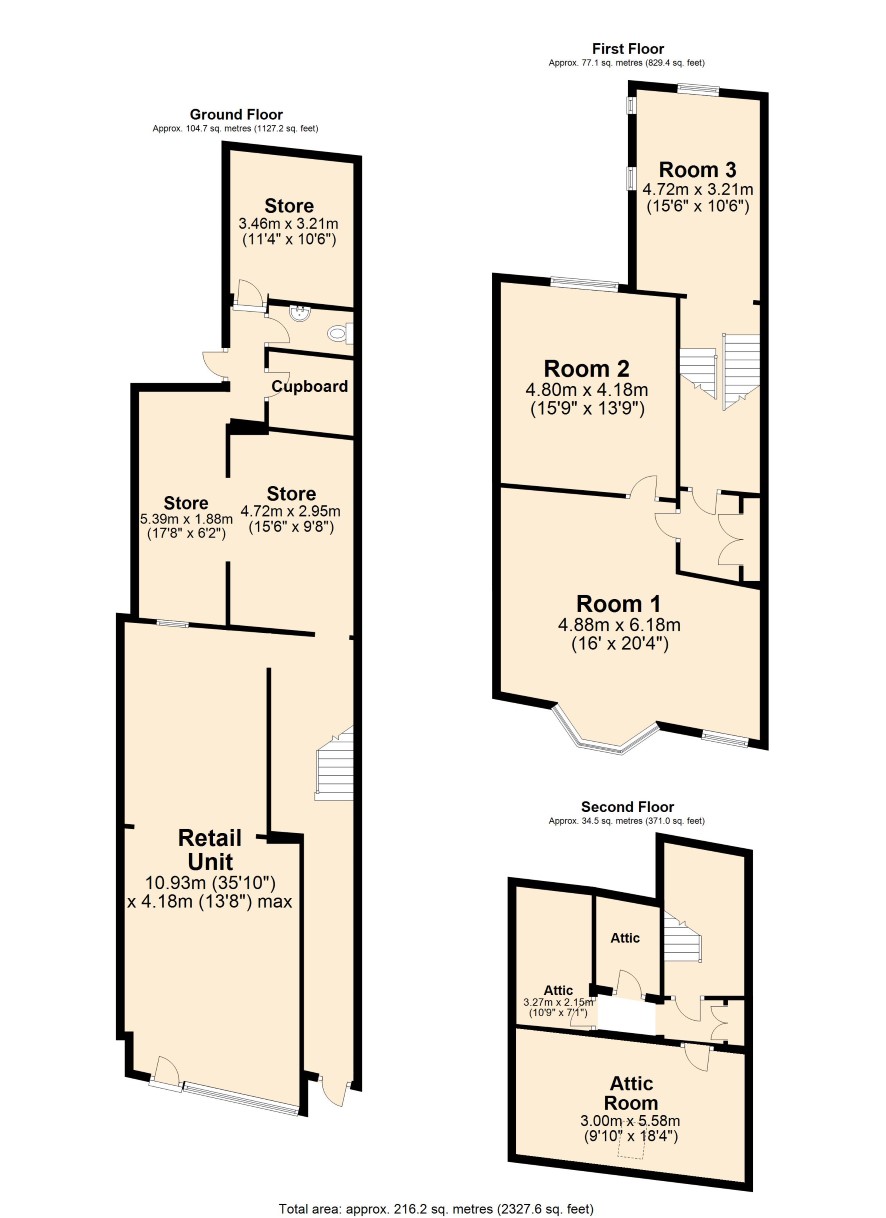 Accommodation Ground Floor: Retail shop (approx. 400 sq ft / 37 sq m), three main stores, rear entrance with separate WC and small store. Separate front entrance hall. First Floor: Landing, three rooms. Second Floor: Landing, attic room, two stores. Outside: Rear yard.