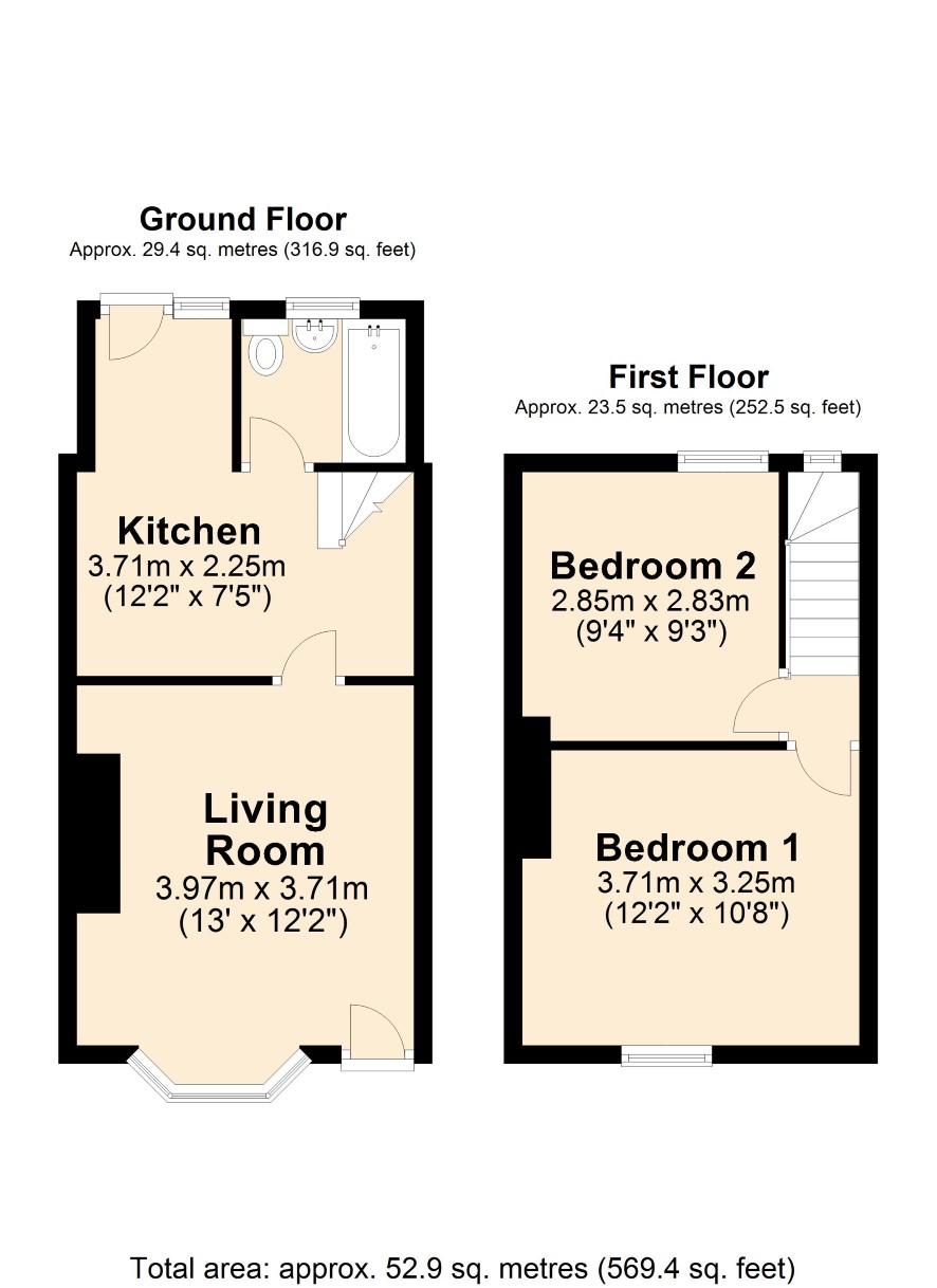 Ground Floor: Living Room, Kitchen, Bathroom/WC. First Floor: Landing,Bedroom One, Bedroom Two. Outside: Stoned forecourt enclosed by metal railings. Concrete rear yard with pedestrian access.