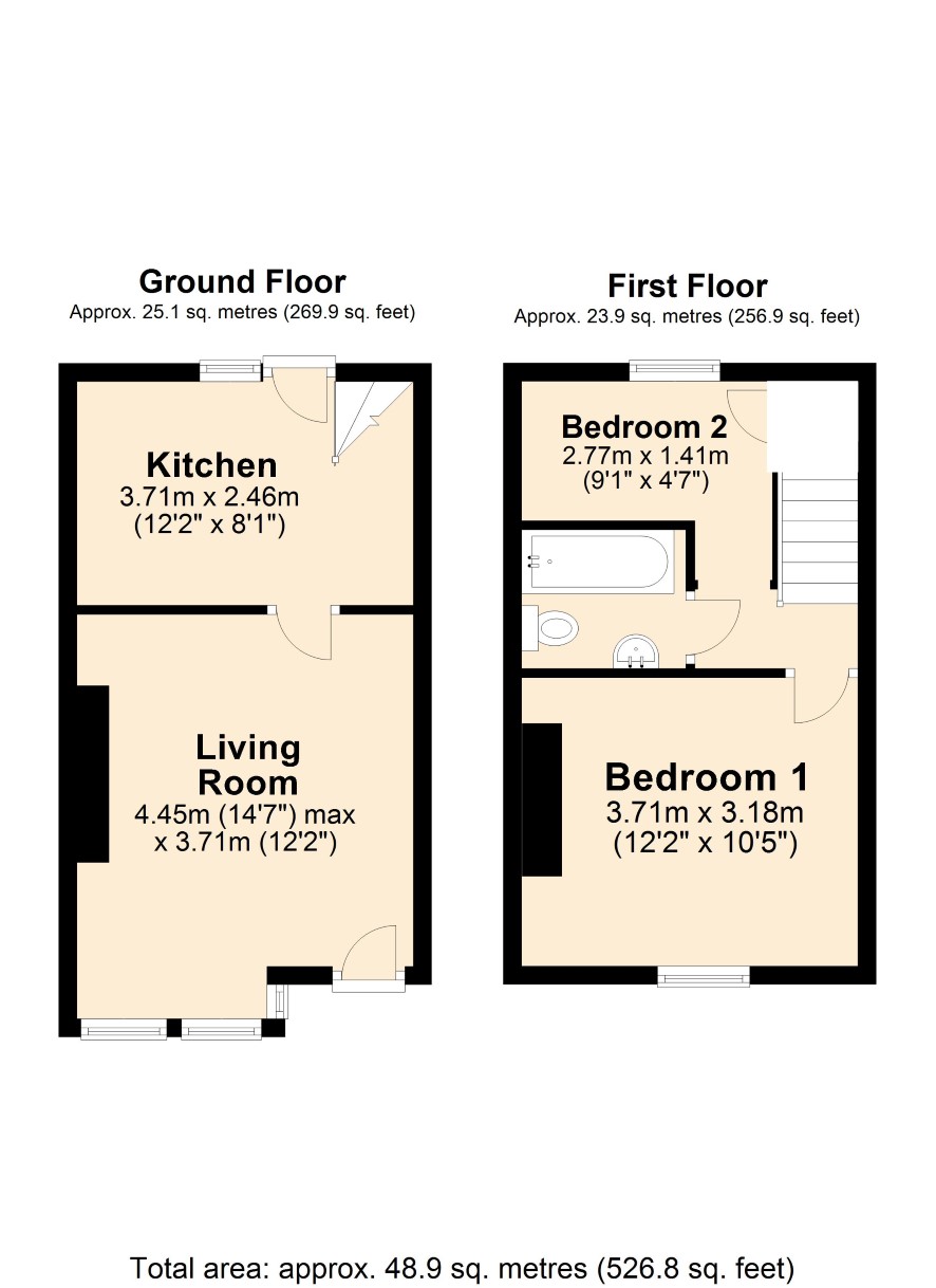 Ground Floor: Living Room, Kitchen. First Floor: Landing,Bedroom One, Bedroom Two, Bathroom/WC. Outside: Small front garden. Walled concrete rear yard with pedestrian access.