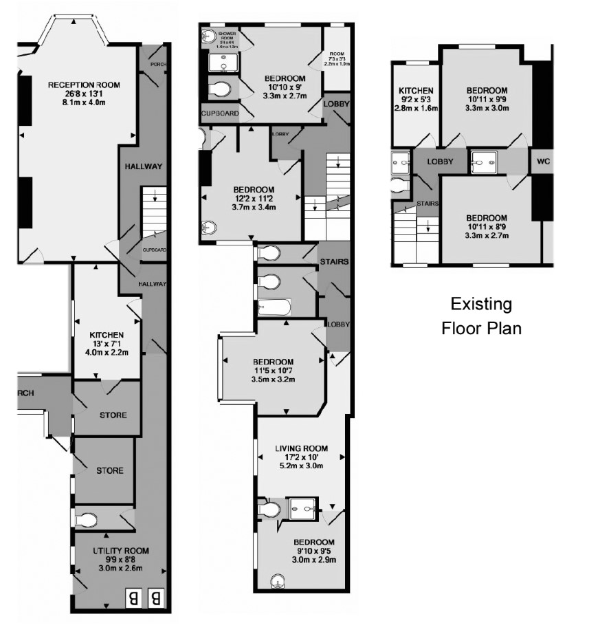 Ground Floor: Hall, through lounge, kitchen, Lobby, WC and utility room First Floor:Landing, four bedrooms, bathroom, WC, living room and shower room. Second Floor: Landing, two bedrooms, kitchen. Outside: Rear courtyard. Each property is fully double glazed. The properties were originally on one heating/hot water system and wiring which has now been separated but will either need to be adapted or re-plumbed/rewired.