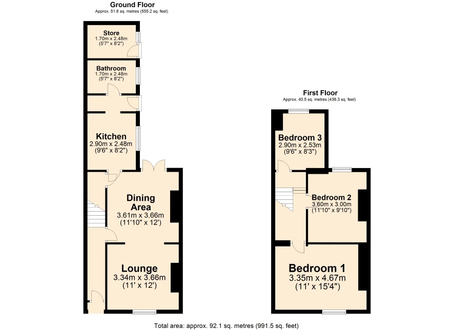 Ground Floor: Entrance Hall, Lounge, Dining Area, Kitchen, Rear Lobby, Bathroom/WC. First Floor: Landing, Bedroom One, Bedroom Two, Bedroom Three. Outside: Fenced concrete rear yard. Attached store building. Additional garden area alongside the house is fully enclosed with fencing. Rear pedestrian access.