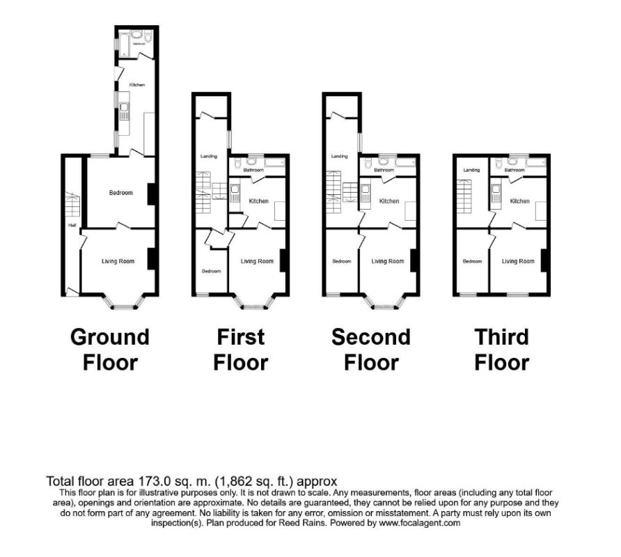 Flat 1 One Bedroom Apartment with Garden - Let at £530pcm Door from communal hallway into living room, bay window to the front, wall mounted radiator and feature fireplace, door into bedroom with wall mounted radiator and window to the rear. Door into the kitchen with range of wall and base units, sink and space for appliances, door out to rear garden and door in door into bathroom with shower over bath, window to the side, pedestal basin and WC. Living Room - 4.10 × 4.16 Bedroom - 3.69 x 3.81 Kitchen - 1.99 × 5.20 Bathroom - 1.86 x 1.56 EPC Grade D and Council Tax Band A Flat 2 One Bedroom First Floor Apartment - Let £500pcm Door from communal hallway on first floor into entrance hall, door into bedroom with window to the front, door in to living room with window to the front. Door from living room into the kitchen with wall and base units, sink and space for appliances - door into bathroom with bath, basin and WC, window to the rear. Living Room - 3.07 × 4.12 Bedroom - 1.79 x 3.42 Kitchen - 3.09 × 2.71 Bathroom - 3.10 x 1.06 EPC Grade D and Council Tax Band A Flat 3 One Bedroom Second Floor Flat - Let at £500pcm Door from second floor landing into hallway, door into bedroom with bathroom to the rear, bath, WC and sink. Door from hall in to living with window at the front and door into the kitchen wall and base units, window to the front, sink and space for appliances. Living Room - 3.07 × 4.12 Kitchen - 1.77 × 3.42 Bedroom - 3.08 × 2.70 Bathroom - 3.09 × 1.06 EPC Grade C and Council Tax Band A Flat 4 One Bedroom Top Floor Flat - Previously Let at £475pcm (Vacant) Door from third floor landing into kitchen with fitted wall and base units, sink and space for appliances, door into bathroom with bath, sink and WC. Door into living room with window to the front and door into bedroom with window to the front. Living Room - 3.07 × 3.42 Kitchen - 3.08 × 2.70 Bathr