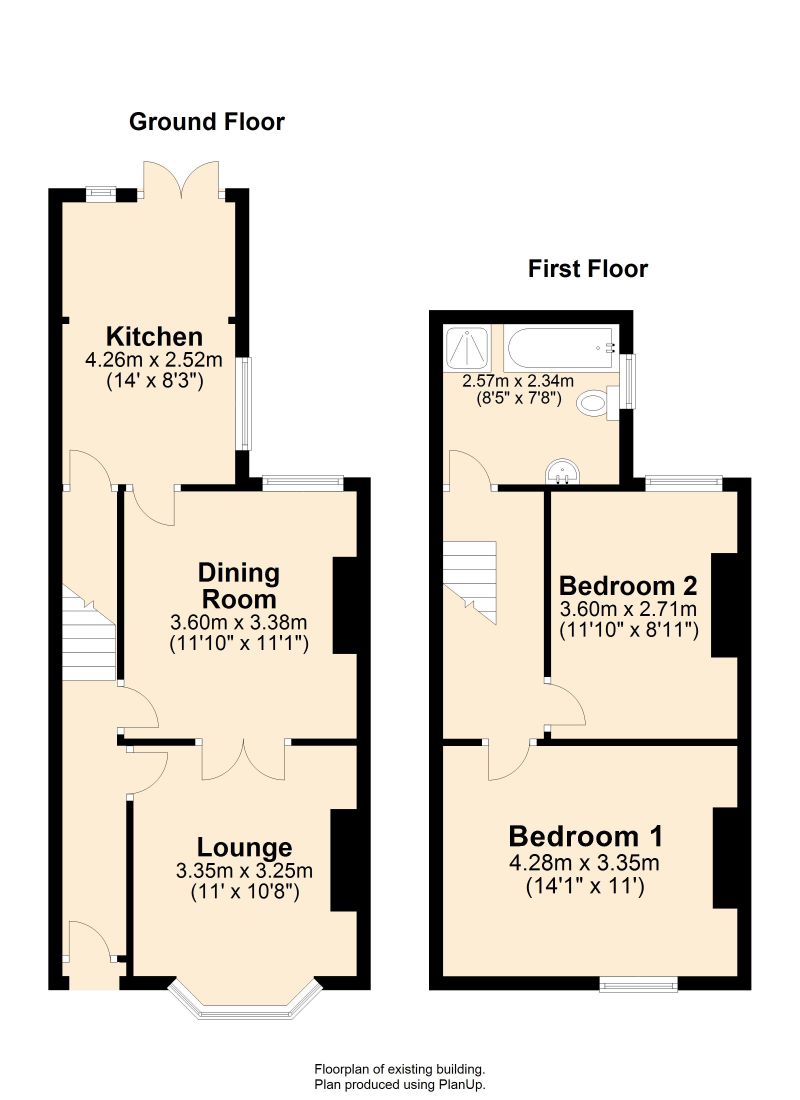 GROUND FLOOR Entrance Hall: Radiator. Living Room: Front bay window, fireplace, radiator, ceiling coving and multi-pane glazed double doors to: Dining Room: Fireplace, radiator annd ceiling coving. Kitchen: Fitted with base and wall cabinets including electric oven and hob, worktops with sink, wall-mounted gas boiler, understairs cupboard and French doors to rear yard. FIRST FLOOR Bedroom One: Radiator and ceiling coving. Bedroom Two: Radiator and ceiling coving. Bathroom / WC: Fitted with a three piece suite and separate shower enclosure. Tiled floor and radiator.