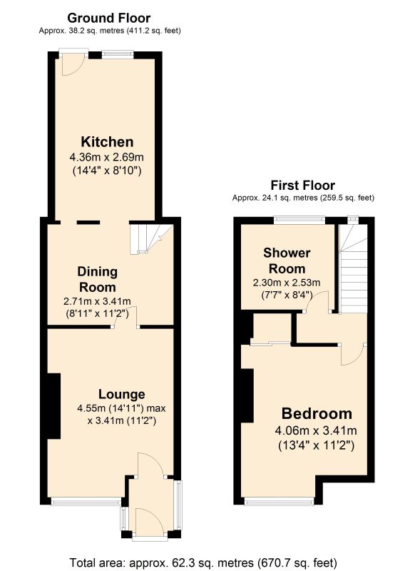 Ground Floor: Storm Porch, Lounge, Dining Room, Kitchen. First Floor: Landing, bedroom, Shower Room