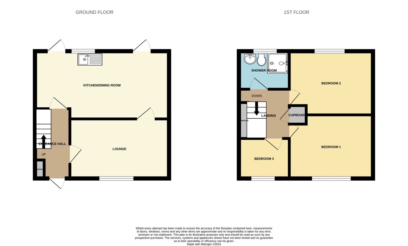 Entrance Porch - Access to the property is via a front double-glazed door with side windows. Door then leads to... Entrance Hallway - The entrance hallway has a built-in storage cupboard and a staircase that leads to the first floor, which has an additional handy storage cupboard under. Lounge 14'9" x 10'6" (4.5m x 3.2m) - A spacious lounge having a double-glazed window to the front. An ornate fireplace houses a gas fire with a tiled back and hearth. Dining Kitchen 11'1" x 21'3" (3.38m x 6.48m) - Another spacious room having two doors leading to the rear garden. Fitted with a range of base and units with contrasting work surfaces. Single sink inset with mixer tap over. Gas cooker point and wall-mounted gas boiler. Plumbing for automatic washing machine. First Floor Landing - A central landing providing access to the three bedrooms and shower room. Loft access. Bedroom One 12'3" x 10'11" (3.73m x 3.33m) - The largest of the three bedrooms having a double glazed window to the front. Built in storage cupboard. Bedroom Two 14'10" x 9' (4.52m x 2.74m) - Having a double glazed window overlooking the rear garden. Storage cupboard. Bedroom Three 10'8" x 8' (3.25m x 2.44m) - The third bedroom is also spacious having a front facing double glazed window and a range of storage cupboards. Shower Room 8' x 5'8" (2.44m x 1.73m) - Having a double glazed window to the rear, fitted with a double shower unit, low flush w.c. and a pedestal wash hand basin.