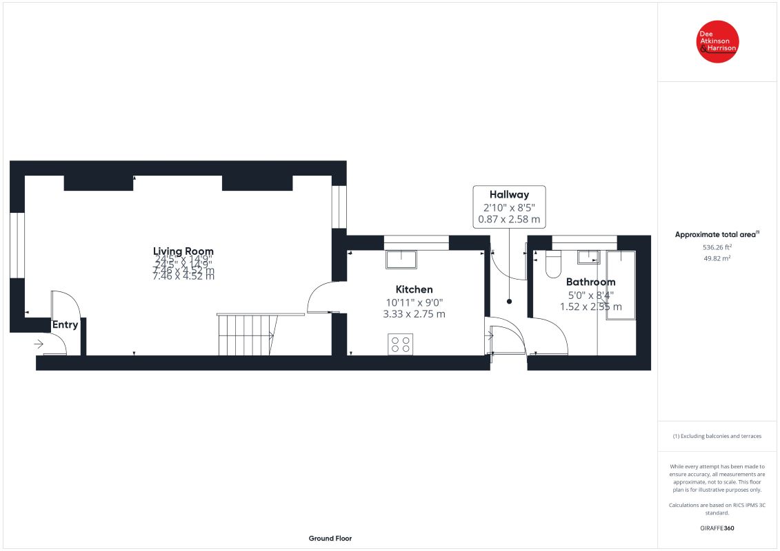 Ground Floor Sitting/Dining Room 24'5" x 14'9" (7.46m x 4.52m) Window to the front and rear, staircase leading to first floor. An under-stairs storage cupboard provides practical storage solutions. Radiator. Kitchen 10'11" x 14'9" (3.33m x 2.75m) The kitchen enjoys a rear aspect. Fitted with maple-style base and wall-mounted cabinets offering cupboard and drawer space. Complementary laminated work surfaces, stainless steel sink unit, electric single oven and gas hob. Rear Hallway 2'10" x 8'5" (0.87m x 2.58m). Bathroom 10'4" x 5'2" (3.15m x 1.57m) The bathroom is appointed with a three-piece suite comprising a bath, washbasin, and WC. Tiled to all walls. First Floor Landing The central landing has doors leading off to the individual rooms. Principal Bedroom 12'1" x 13'8" (3.70m x 4.17m) With a front aspect. The room is equipped with fitted wardrobes along one wall. Bedroom 2 11'9" x 9'1" (3.59m x 2.79m) The room is fitted with a radiator and a rear aspect. Bedroom 3 10'11" x 8'11" (3.35m x 2.73m) The room is fitted with a radiator and a rear aspect.