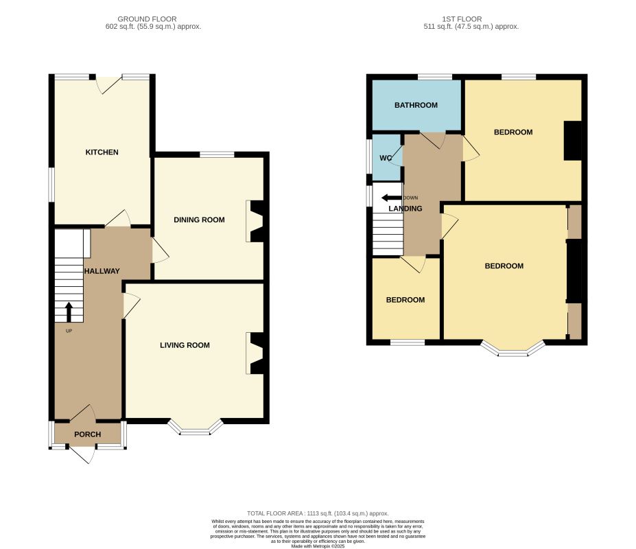 Ground Floor Entrance Porch Hallway Living Room 13'8" x 14'4" (4.17m x 4.37m) A spacious living room with a bay window, a feature fireplace, a radiator and UPVC double glazed window Dining Room 12'2" x 10'11" (3.7m x 3.33m) The second reception has high ceilings, a feature fireplace, a UPVC double-glazed window, and a radiator. Kitchen 9'8" x 14'3" (2.95m x 4.34m) An extended kitchen with both wall and base units with worktop over, plumbing for washing machine, space for appliances, built-in storage cupboard, UPVC double glazed windows and door out to rear garden. First Floor Landing Bedroom One 14'7" x 11'1" (4.45m x 3.38m) A large double bedroom with built-in storage on either side of the chimney breast, UPVC double glazed window and a radiator. Bedroom Two 12' x 11'7" (3.66m x 3.53m) A spacious double bedroom with a UPVC double glazed window and a radiator. Bedroom Three 7'5" x 8'3" (2.26m x 2.51m) The third bedroom has an UPVC double-glazed window and a radiator. Bathroom 8'3" x 5'3" (2.51m x 1.6m) Family bathroom with panelled bath, hand wash basin, shower cubicle and UPVC double glazed window. Separate W.C. With a low-flush W.C and UPVC double-glazed window.