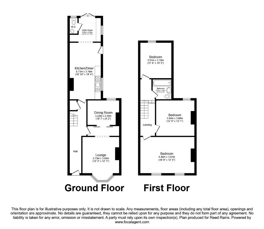 Ground Floor: Hallway, Lounge, Dining Room, Kitchen/Diner, Utility Room, Downstairs WC. First Floor: Landing leading to three bedrooms and a family bathroom.