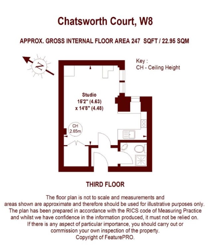 Third Floor Studio Room Kitchen Area Shower Room with WC & wash basin GIA 22.95 sq ft (247 sq ft)