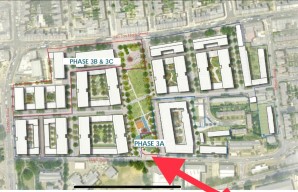 Immediately to the north of the site, a neighbourhood park is proposed measuring approximately 60mx 180m. Buildings of approximately 10 storeys are proposed on either side of the park. Phase 1 to the east is currently under construction.