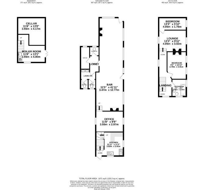 The property comprises a pub with a flat above (total floor area of 1,671 sq ft) arranged over basement, ground and first floors (suis generis). The overall plot size measures 2,089 sq ft.