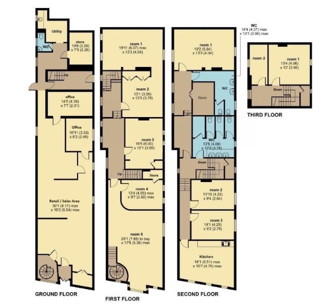 Lower Ground Floor Basement Ground Floor Retail Space Two Offices Kitchenette Store Room WC G.I.A Approximately 1,166 sq ft First Floor Five Rooms Store Room G.I.A Approximately 1,092 sq ft Second Floor Three Rooms Kitchen Store Room Two WC's G.I.A Approximately 785 sq ft Third Floor Two Rooms G.I.A Approximately 297 sq ft