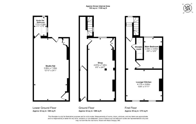 Lower Ground Floor Studio Room Bathroom Ground Floor Shop Area First Floor Reception Room with Open Plan Kitchen (not fitted) Bedroom Bathroom