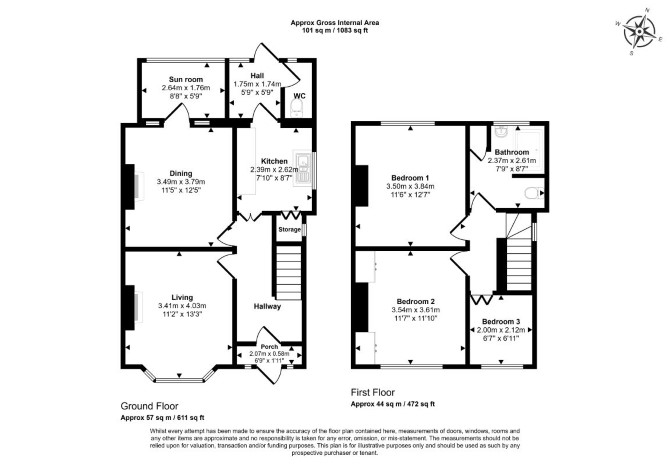 Ground Floor Two Reception Rooms Kitchen Utility Room Study Separate WC First Floor Three Bedrooms Bathroom GIA Approximately: 101 sq m (1,083 sq ft)