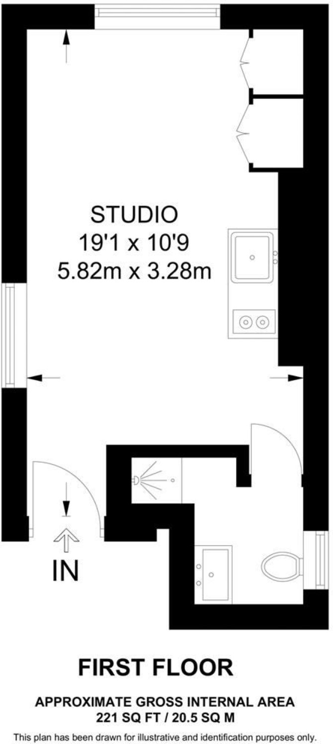 The property comprises a first floor studio flat situated within a within a mid terrace building arranged over ground and first floors.