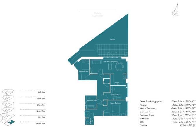 Ground Floor Reception Room with Open Plan Kitchen Three Bedrooms Bathroom with WC & wash basin Separate WC & wash basin G.I.A = 984 sq ft