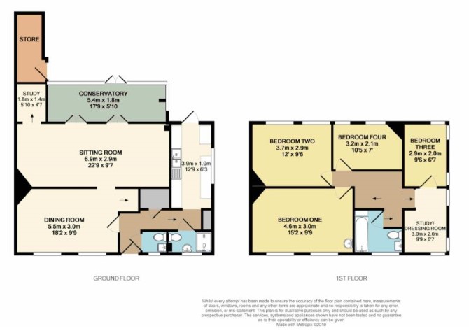 Ground Floor Two Reception Rooms Kitchen Study Separate WC Shower Room with WC and wash basin Conservatory First Floor Four Bedrooms Dressing Room Bathroom with WC and wash basin