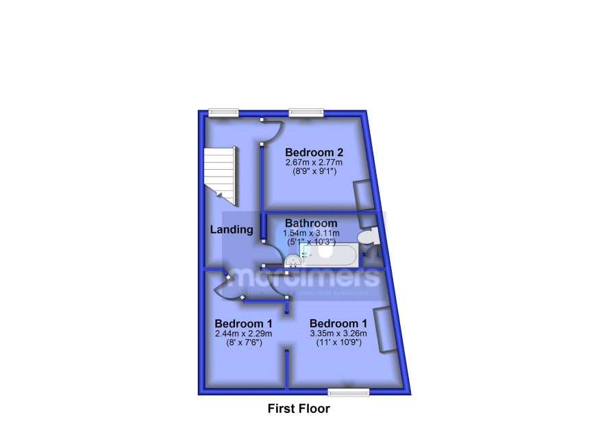 Landing Bedroom One 11’0’’ x 10’9’’ (3.35m x 3.26m) plus 8’0’’ x 7’6’’ (2.44m x 2.29m) Bedroom Two 8’9’’ x 9’1’’ (2.67m x 2.77m) Bathroom 5’1’’ x 10’3’’ (1.54m x 3.11m)