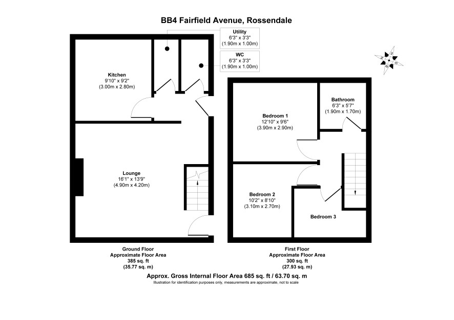 Lounge 16’1” x 13’9” (4.90m x 4.20m) Kitchen 9’10” x 9’2” (3.00m x 2.80m) Utility Room 6’3” x 3’3” (1.90m x 1.00m) WC
