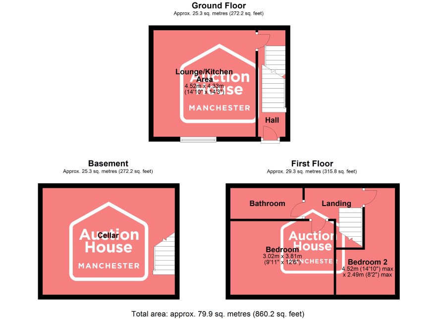 Landing Bedroom One 12’6” into cupboard x 9’11” (3.8m into cupboard x 3.02m) with boiler and radiator. Bedroom Two 8’2” x 6’3” plus 3’7” x 8’5” (2.48m x 1.90m plus 1.09m x 2.56m) with radiator. Bathroom with three piece suit.