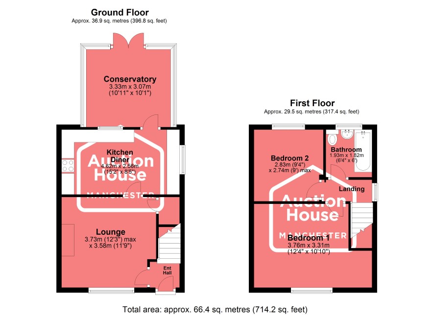 Landing Bedroom One 12'4" x 10'10" (3.76m x 3.3m) Bedroom Two 9'4" x 9' (2.84m x 2.74m) Bathroom 6'4" x 6' (1.93m x 1.83m)