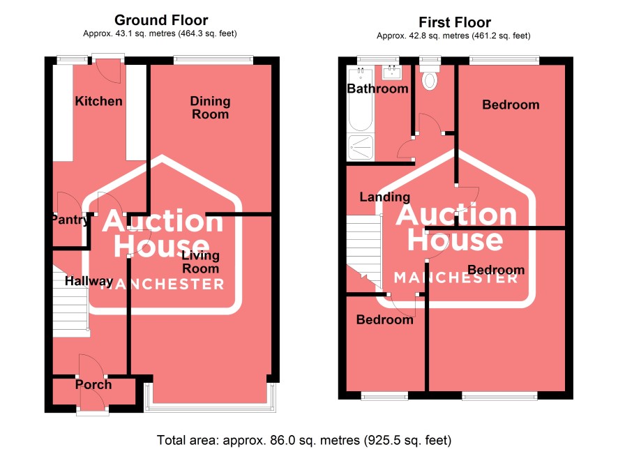 Porch Hallway 10' x 5'11" (3.05m x 1.8m) Lounge 12'9" x 11'4" (3.89m x 3.45m) Dining Room 11'11" x 9'9" (3.63m x 2.97m) Kitchen 11'11" x 7'6" (3.63m x 2.29m) Pantry 2'9" x 2'5" (0.84m x 0.74m)