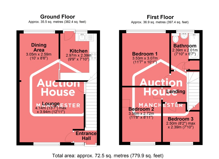 Landing Bedroom 1 11'7" x 10'1" (3.53m x 3.07m) Bedroom 2 11'8" x 8'11" (3.56m x2.72m) Bedroom 3 8'2" max x 7'10” (2.50m max x2.39m) Bathroom 7'10" x 6'7" (2.39m x2.01m)