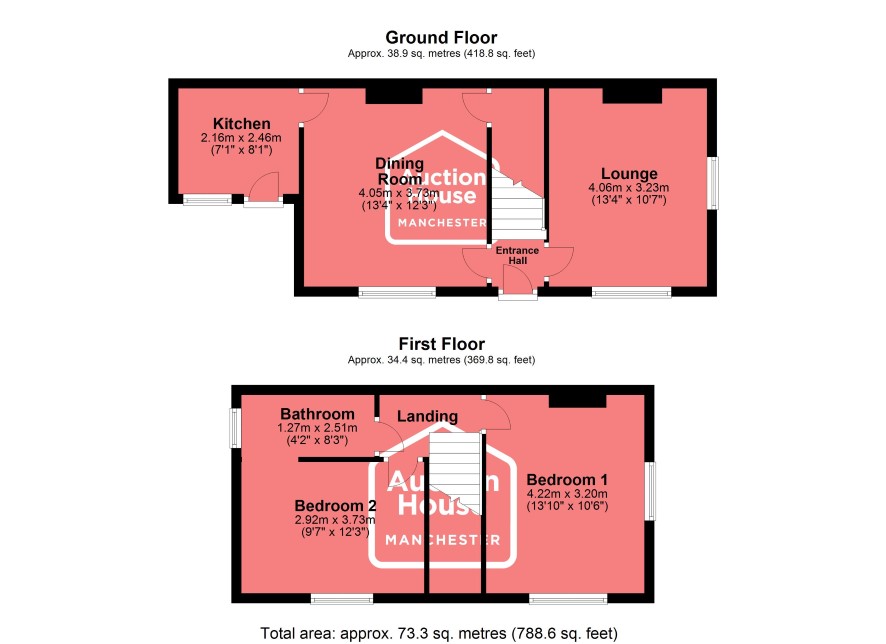 Entrance Hall Lounge 4.06m (13'4") x 3.23m (10'7") Dining Room 4.05m (13'4") x 3.73m (12'3") Kitchen 2.46m (8'1") x 2.16m (7'1") First Floor Landing Bathroom Bedroom 1 4.22m (13'10") x 3.20m (10'6") Bedroom 2 3.73m (12'3") x 2.92m (9'7")