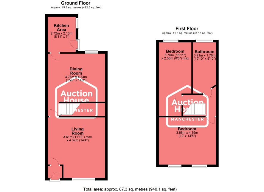 Living Room 4.37m x 3.61m (14'4" x 11'10") Dining Room 4.78m x 4.34m (15'8" x 14'3") Kitchen Area 2.72m x 2.13m (8'11" x 7')