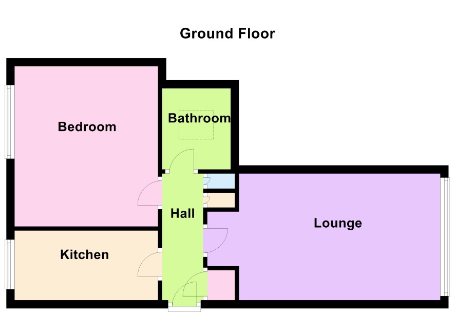 Reception Hall with three useful store cupboards and access to:- Lounge 5.7m x 3.1m max with window to front. Kitchen 3.5m x 1.7m with range of base and wall units, Bedroom 3.9m x 3.5m with window to rear, Bathroom with white suite comprising panelled bath, wash hand basin and w.c.