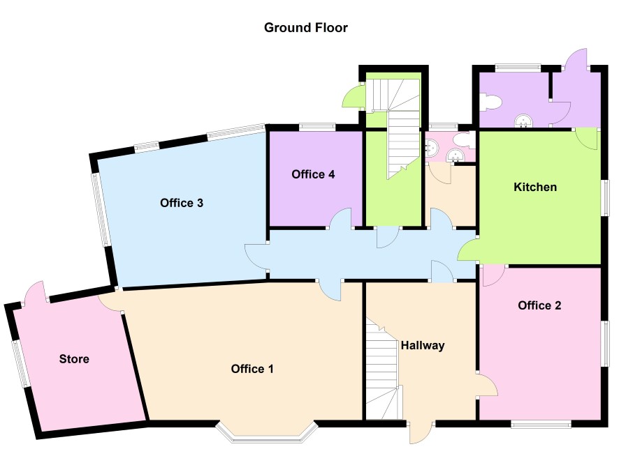 Hallway 3.76m x 3.04m Having Storage cupboard, stairs to the first-floor landing and doors leading off to Office 2 4.19m x 3.58m Having two double glazed windows, radiator and door to kitchen Kitchen 5.46m x 3.35m Having sink, radiator, double glazed window and door to fire exit and downstairs WC Downstairs WC Having toilet, sink, radiator and double glazed window 2nd WC Having toilet, sink, radiator and double glazed window Office 4 2.57m x 2.68m Having radiator and double glazed window Office 3 5.03m x 3.91m Having two radiators and two double glazed windows Office 1 6.83m x 3.7m Having a bay window, two radiators and a door to the storeroom Storeroom Having door for fire exit, radiator and double glazed window. Storage cupboard