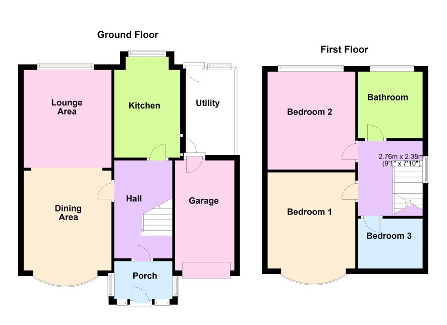 Enclosed Porch leading into Reception Hall with stairs to first floor off, door leads to through Lounge/Dining Room. Dining Area: 3.6m x 3.2m with bay window to front, Lounge area 3.6m x 3.2m with feature fireplace and window to rear. Slightly extended Kitchen 3.2m x 2.4m with sink unit and range of base and wall units. Door leads to Utility Room 2.8m x 1.9m with door to Garage and window and door to rear garden.