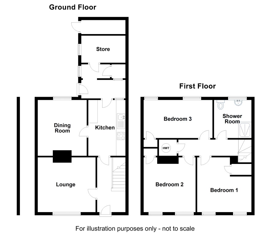 A three bedroomed mid terrace former council property with scope for modernisation and refurbishment with accommodation including two reception rooms, kitchen, shower room and a small range of stores at the rear.