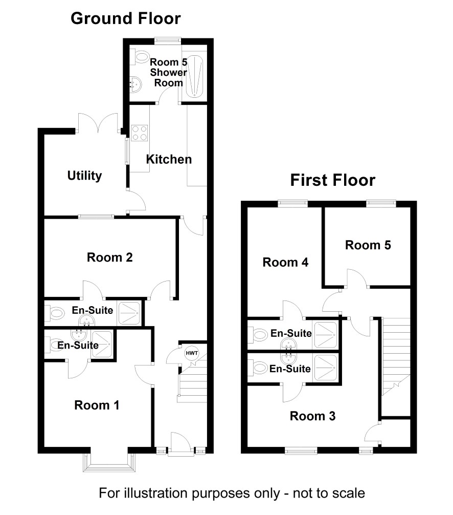 Reception hall, room one, shower room ensuite, room three with shower room ensuite, kitchen, utility/conservatory & bedroom five.