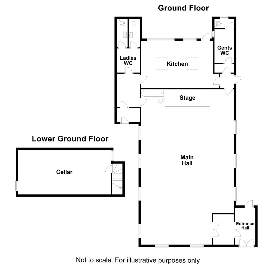 Entrance hall, lobby, main hall, rear lobby, men's bathroom, kitchen, side lobby, ladies bathroom and cellar.