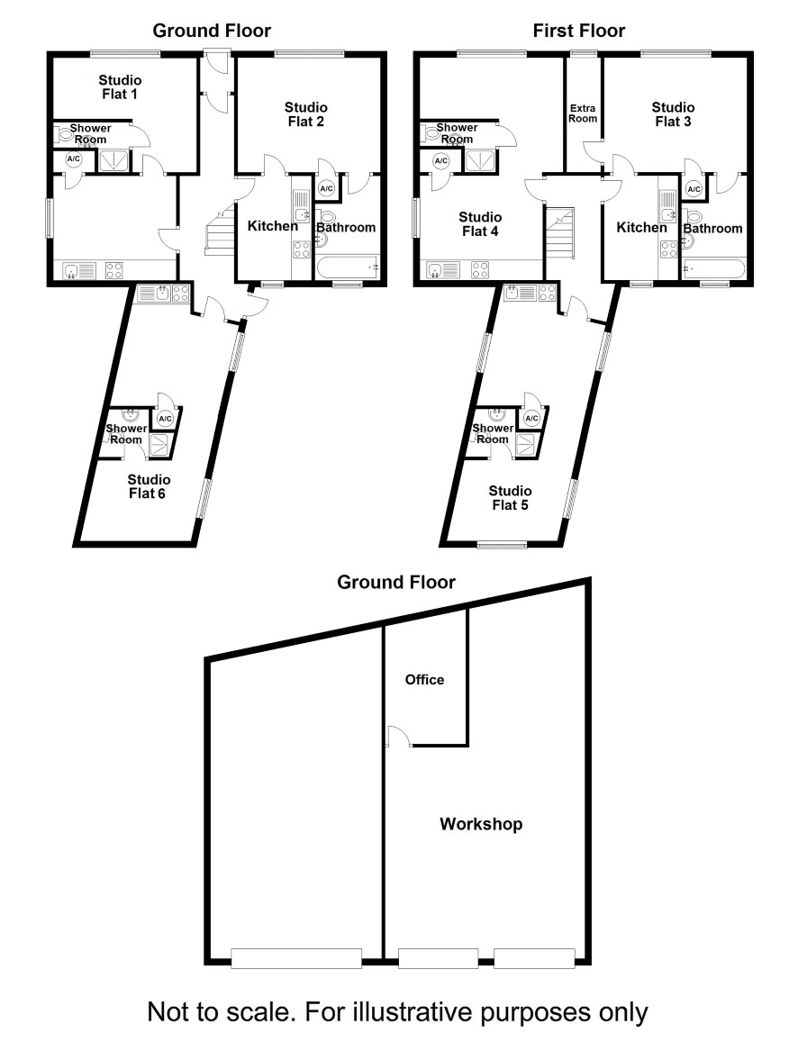 Entrance porch and entrance hall. Studio Flat One - kitchen, lounge/bedroom and shower room. Studio Flat Two - kitchen, lounge/bedroom and bathroom. Studio Flat Six - kitchen/lounge, bedroom and shower room.
