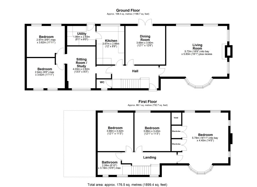 Hall with Cloakroom Living Room 18'9 into bay x 19' plus recess Dining Room 12'1 x 12'6 with doors leading to the garden Kitchen 12' x 8'9 with fitted wall and base units Utility 9'3 x 6'1 Sitting Room/ Study 13'3 x 9'3 Bedroom 9'9 x 11'11 Bedroom 9'8 x 11'11