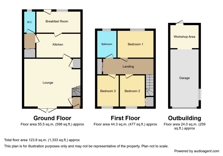 Rear garden, paved area to the front. Garage 19'6 x 9'6 with Workshop Area 9'6 x 7'9