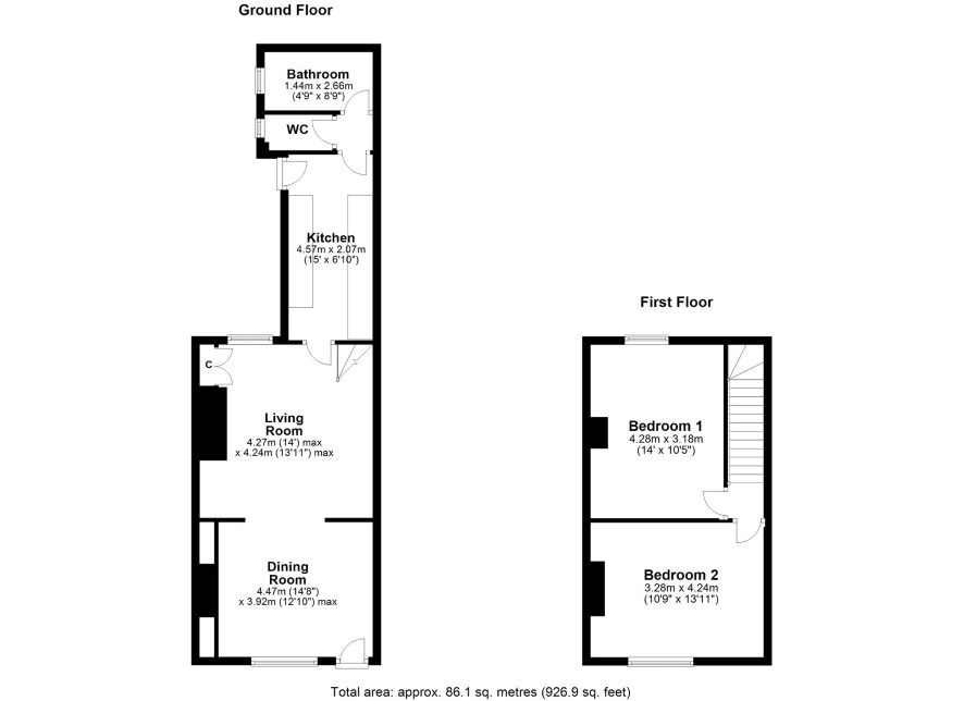 Dining Room 14'8 x 12'10 Living Room 14' x 13'11 Kitchen 15' x 6'10 WC Bathroom 4'9 x 8'9