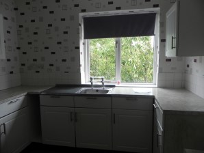 Fitted kitchen with a range of floor and wall units, stainless steel sink unit, window to rear aspect.