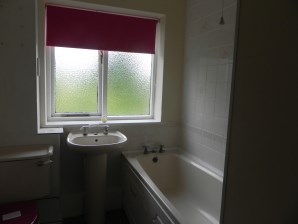 Three piece suite comprising low level WC, pedestal basin, bath, window to rear aspect, single radiator.